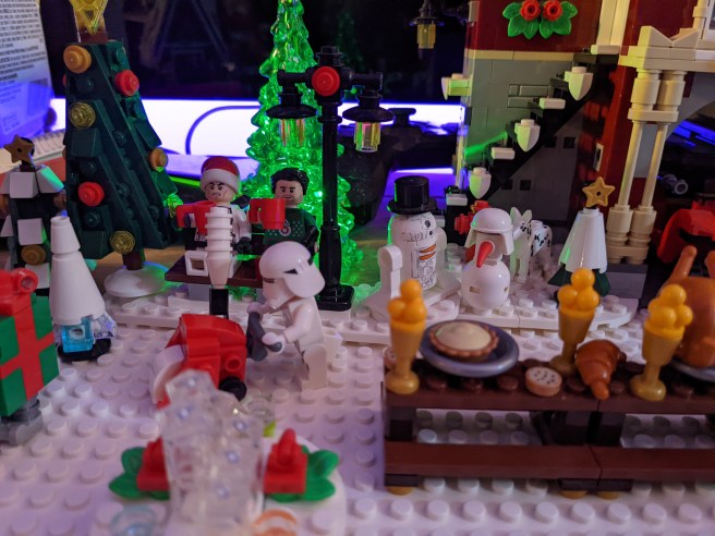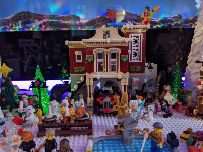 When setting up my Winter/Christmas Village each year – I’ve been doing it for four years now – I try to create small pockets of story within the overall set-up. Things that when you observe it as a whole, you may not notice right away. For instance: there are around five Santas present – though they may not all be your traditional Santa Claus. There are also some surely Stormtroopers and some hunting going on as well.