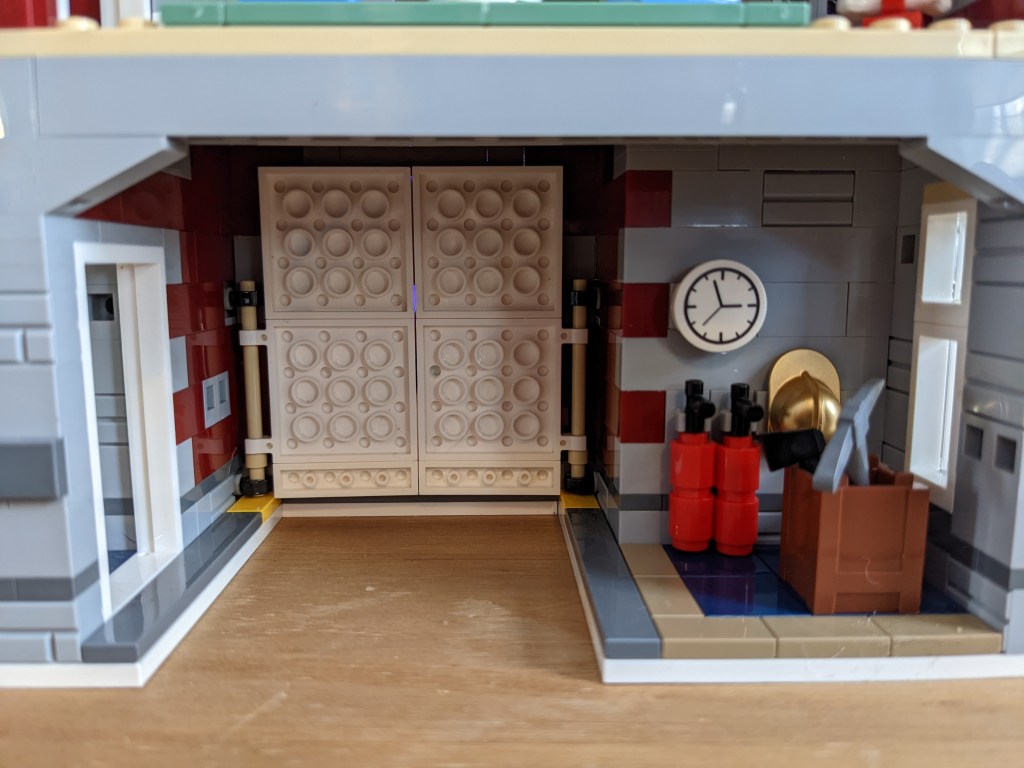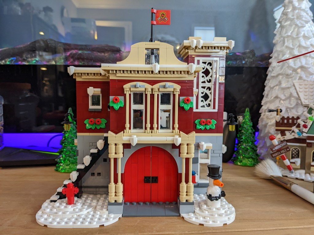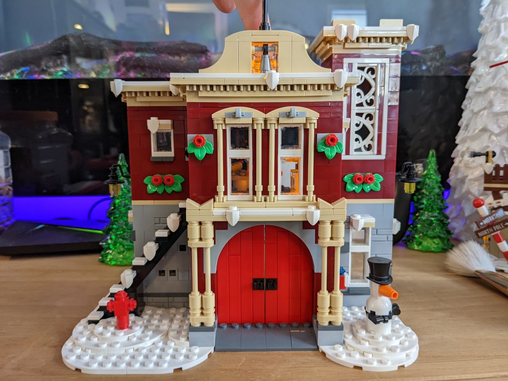 The use of simple, every day bricks to create stunning architectural elements, like the columns on either side of the red doors for the fire truck, and the decorative trim along the roofline. Even the snowman is cleverly designed. The look of the red doors are an example of one of my favorite door types in Lego sets. Being they are built of individual pieces, it really lends the construction to the look of a real, timbered door construction. (Granted, the illusion does not quite hold up on the interior…)