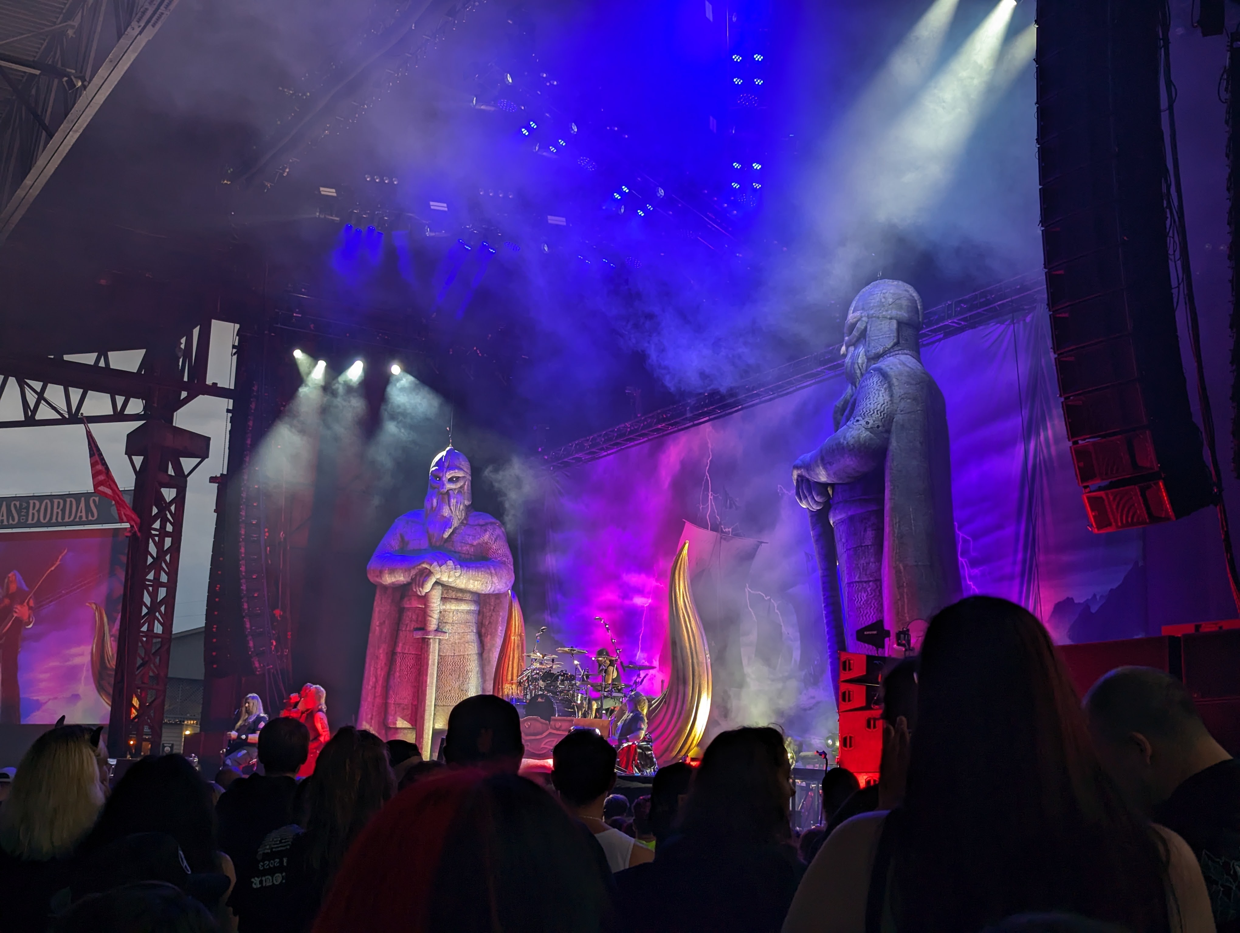 Amon Amarth started promptly at 7:30. I knew little about them. They were Vikings. They played metal. There is one song where the people in the Pit sit down and row. At least one of those things was true. They were not dressed as Vikings, though they did have a couple of the guys in their crew dressed up and they came out twice to perform sword fights on stage, the last one not ending until they shattered one another’s wooden shields. They did play metal; the deep growly kind. And while the entire venue DID row along to “Put Your Back Into The Oar”, I could not tell if people in the Pit actually sat on the floor to do so, or if they were rogue standing rowers.