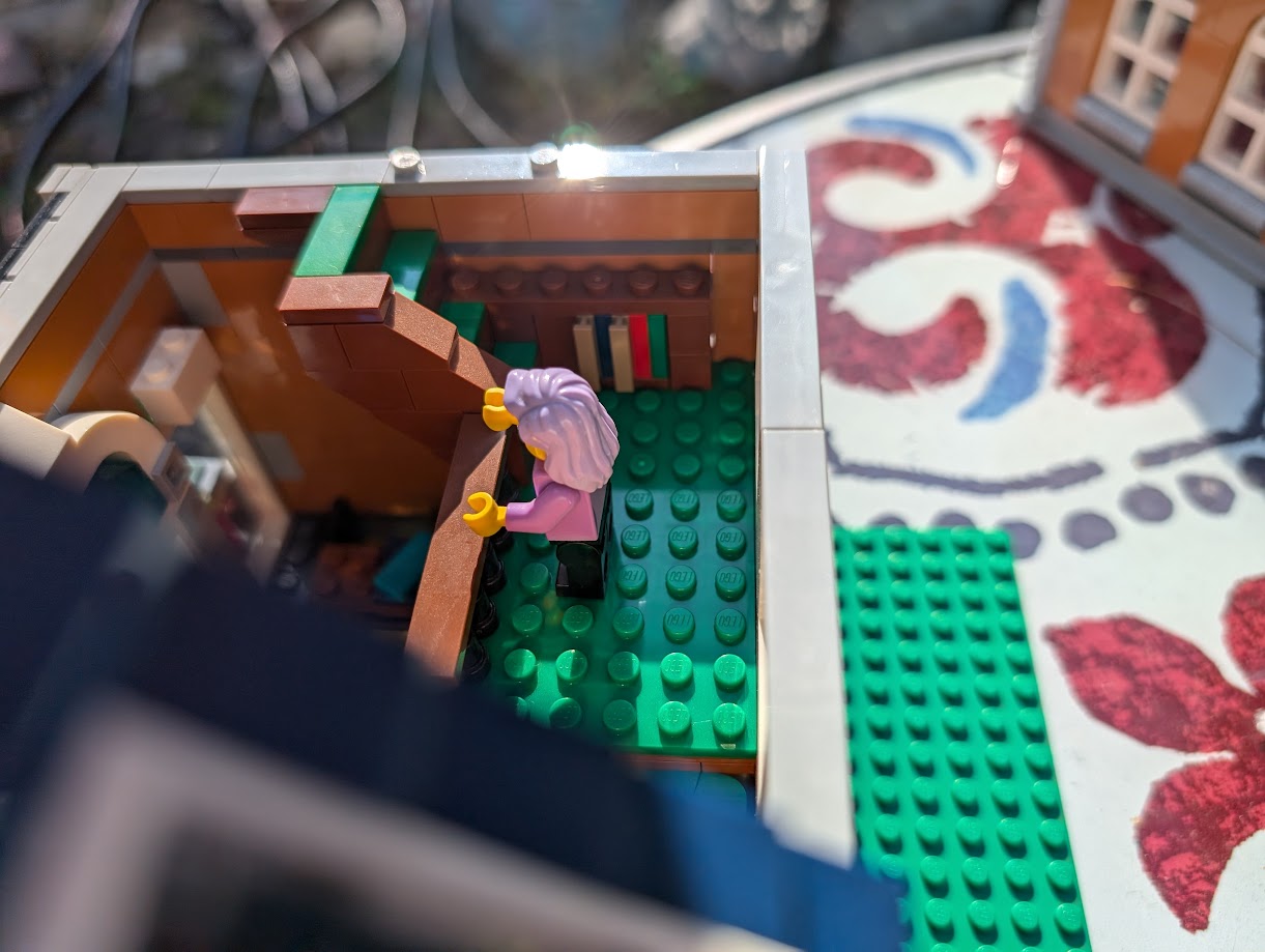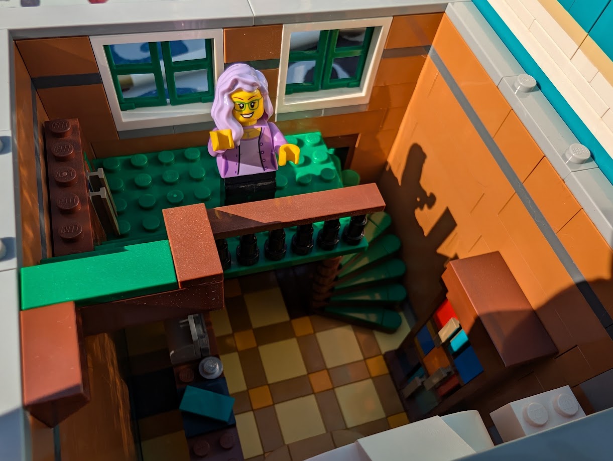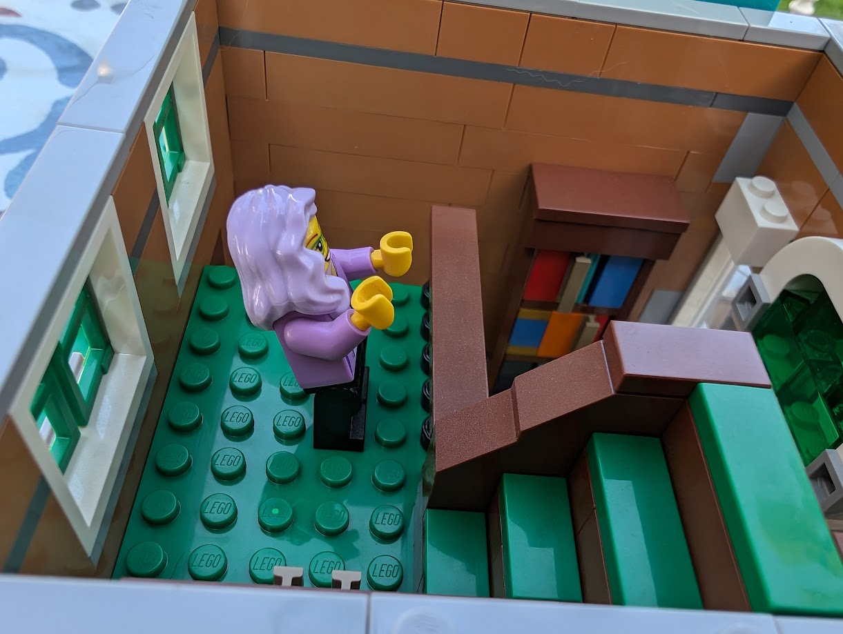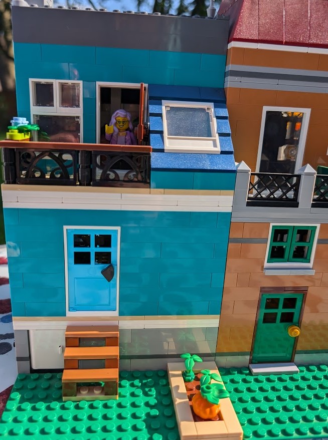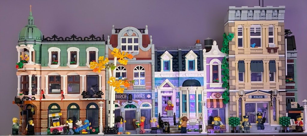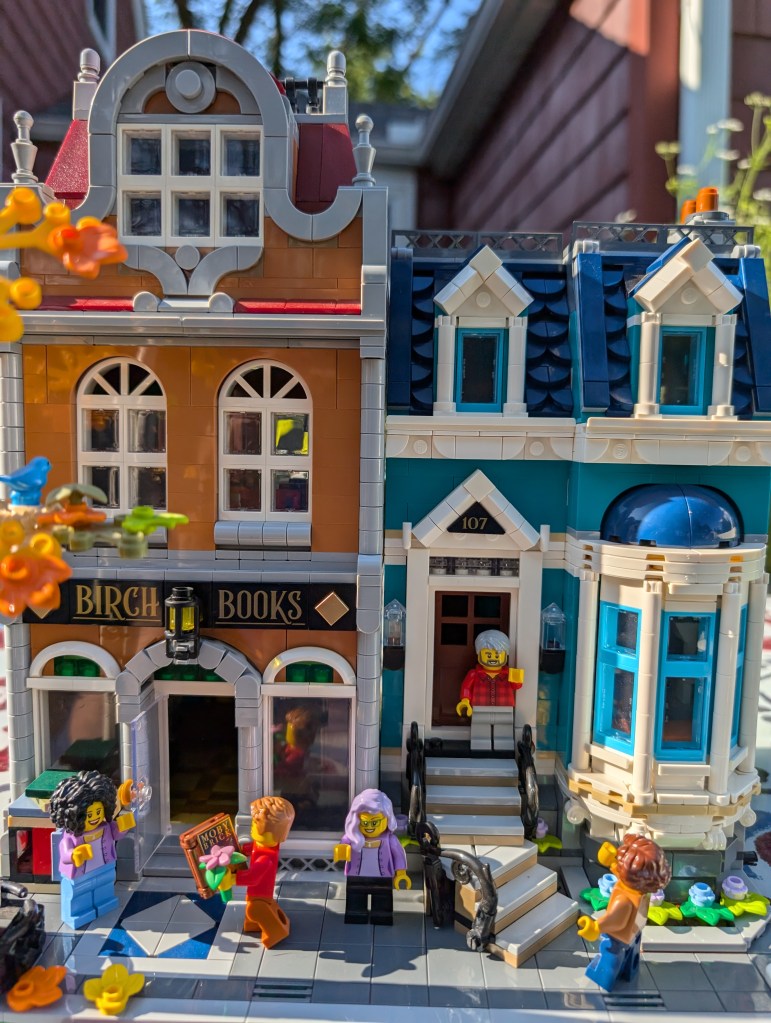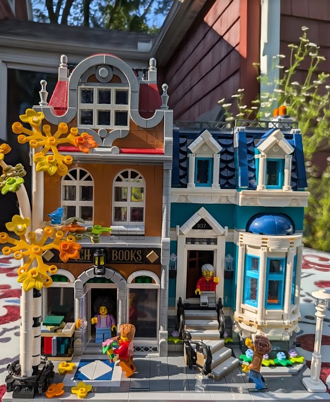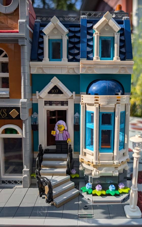 I just love everything about it. The colors are stunning. The sidewalk amazed me – it was my first time building a Modular sidewalk, and I appreciated how ingenious they are! I loved that the two minifigs I have in front of the turquoise house remind me of my mom and dad. And I love the little story the two minifigs at the bookshop tell with so little effort.