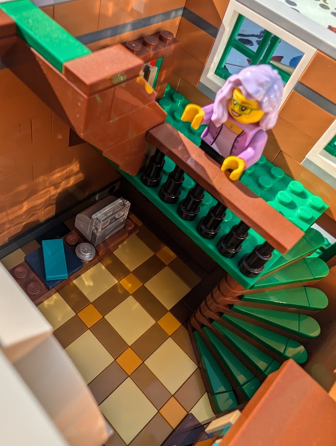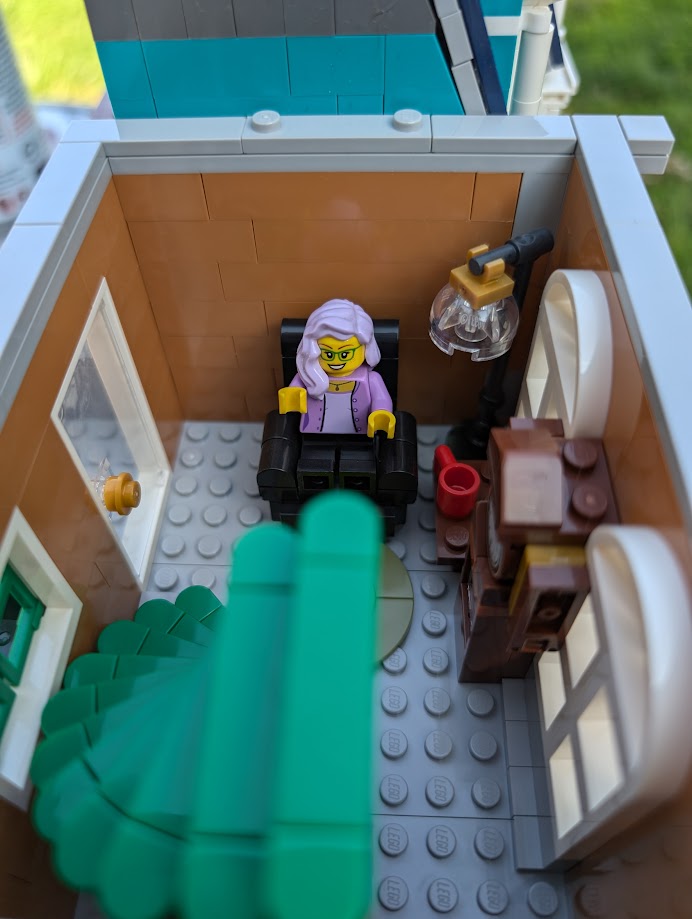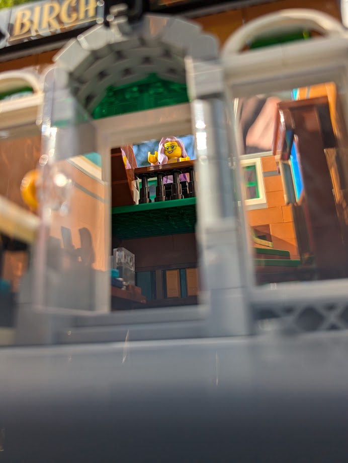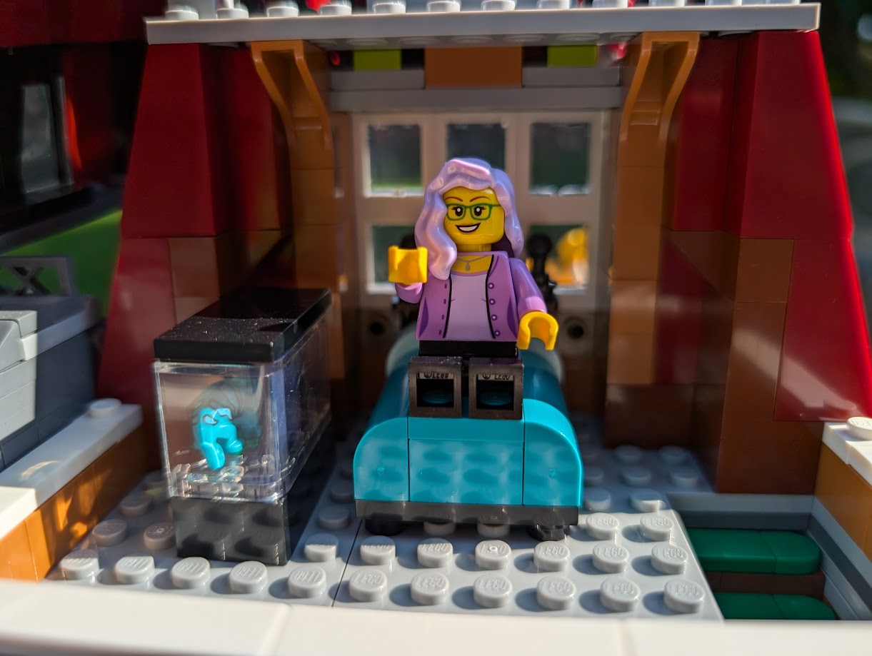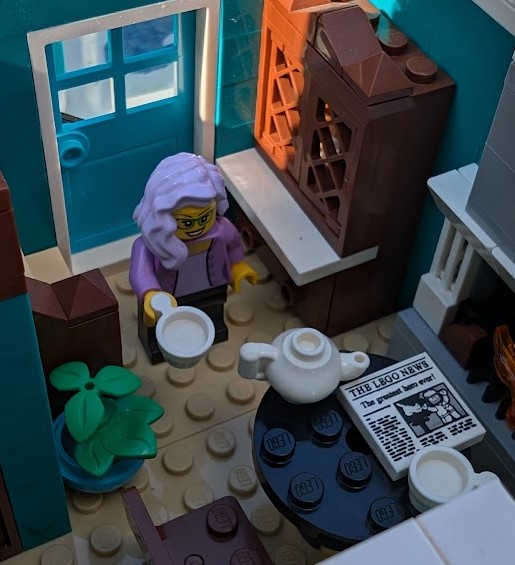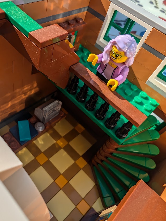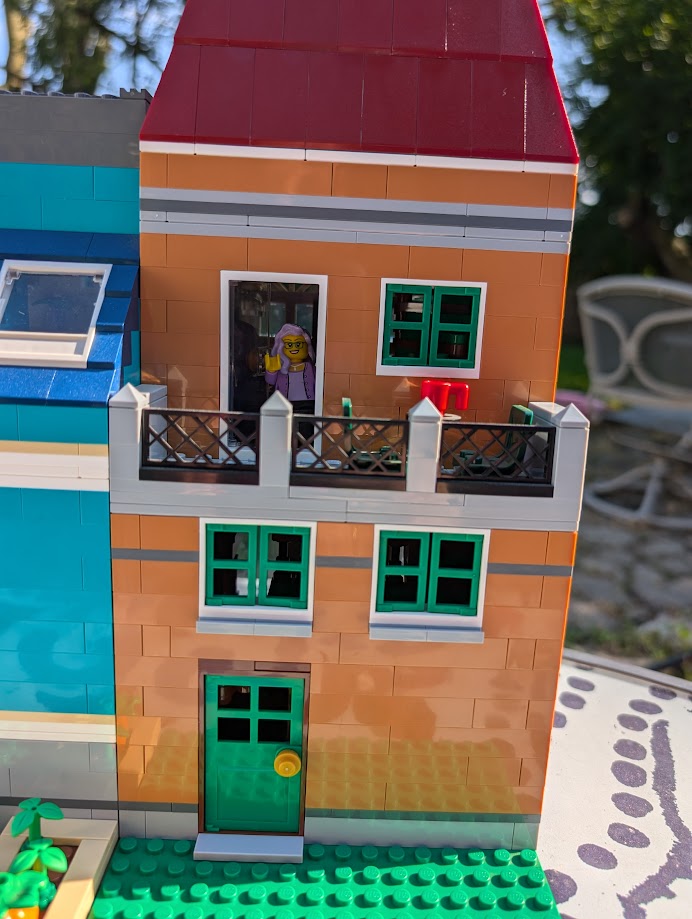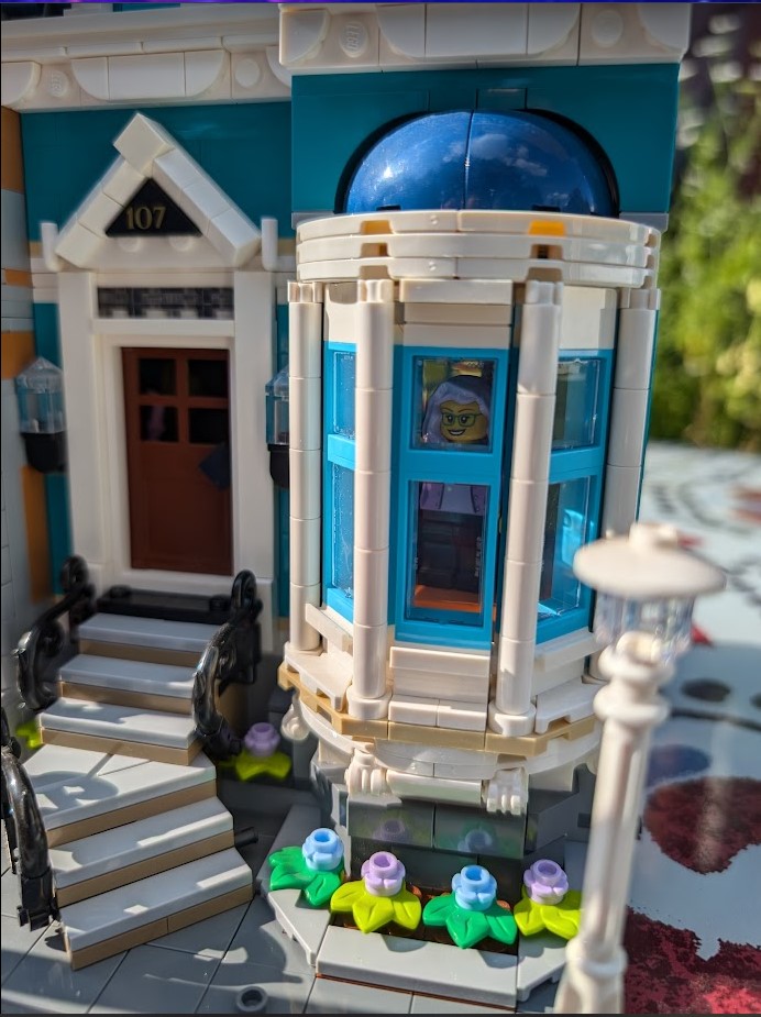 I just love everything about it. The colors are stunning. The sidewalk amazed me – it was my first time building a Modular sidewalk, and I appreciated how ingenious they are! I loved that the two minifigs I have in front of the turquoise house remind me of my mom and dad. And I love the little story the two minifigs at the bookshop tell with so little effort.