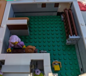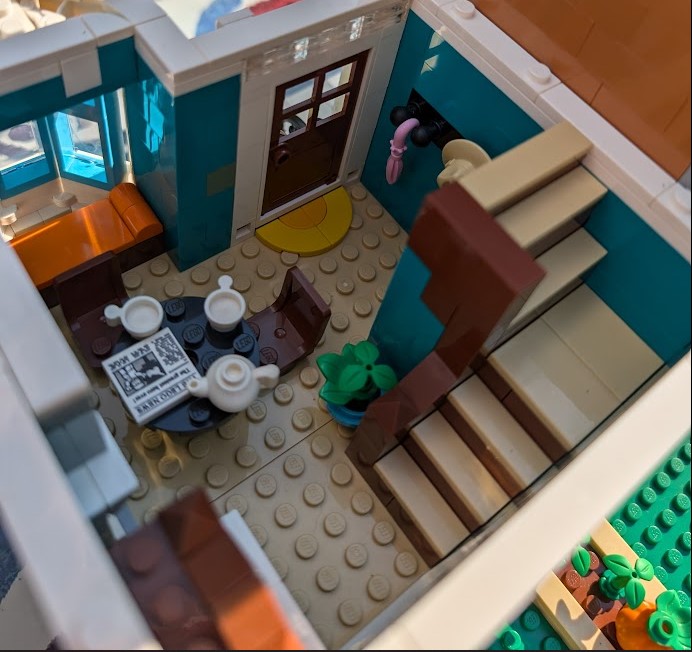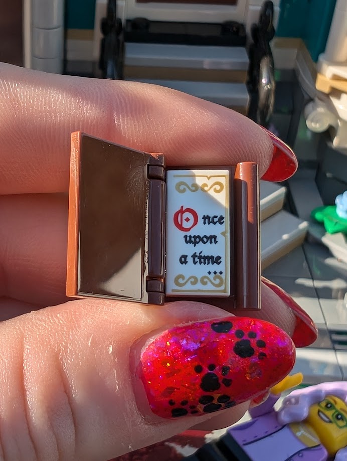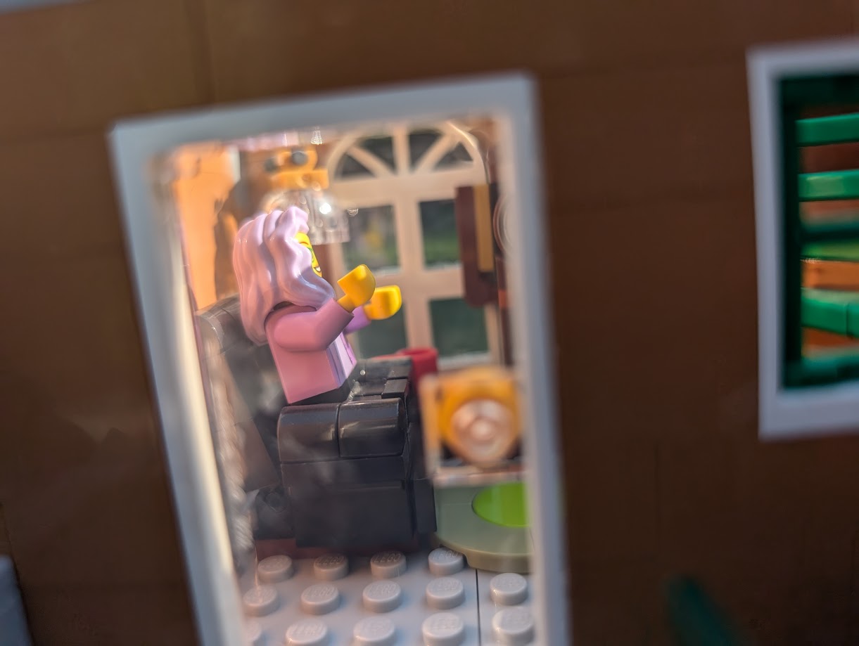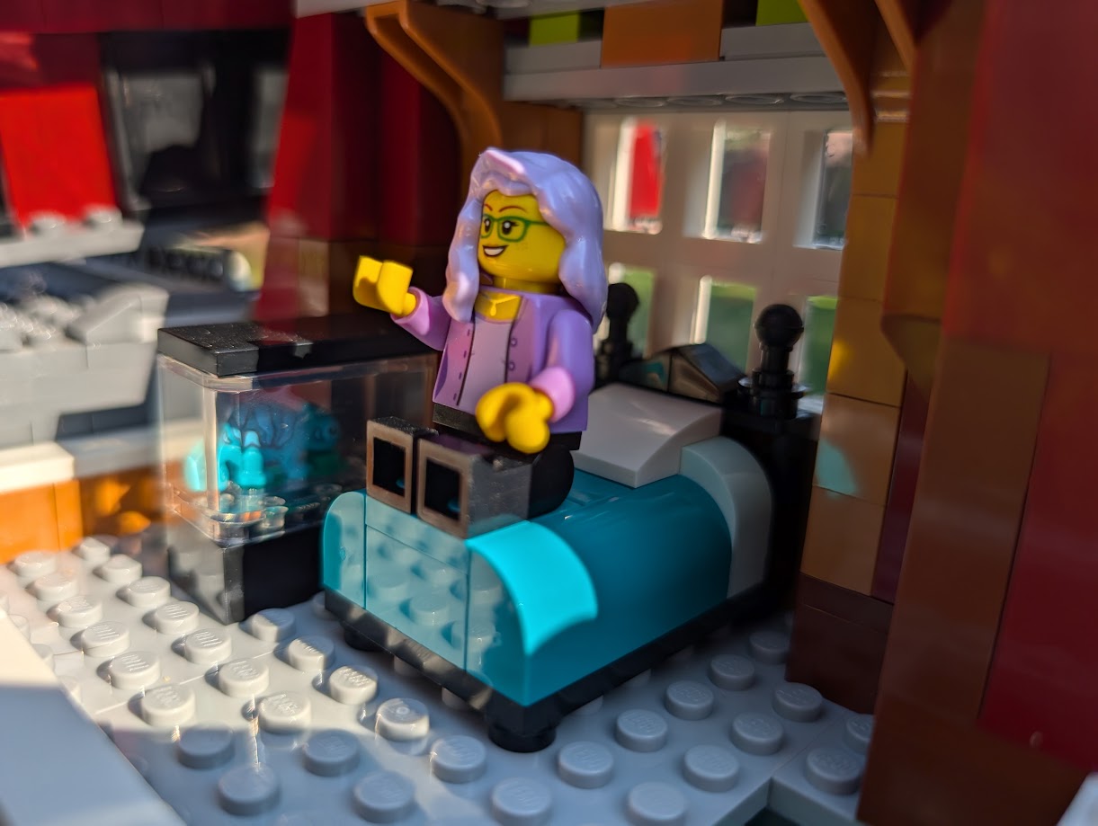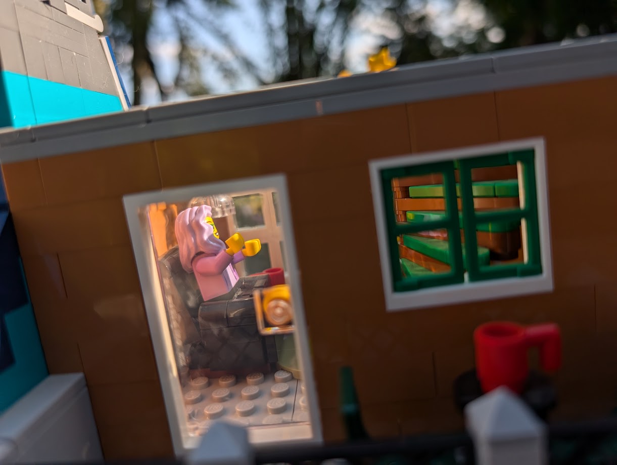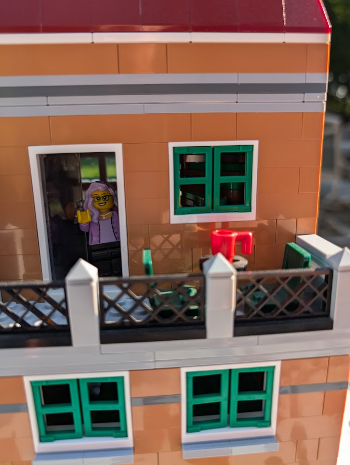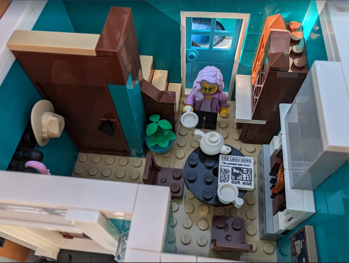I just love everything about it. The colors are stunning. The sidewalk amazed me – it was my first time building a Modular sidewalk, and I appreciated how ingenious they are! I loved that the two minifigs I have in front of the turquoise house remind me of my mom and dad. And I love the little story the two minifigs at the bookshop tell with so little effort.