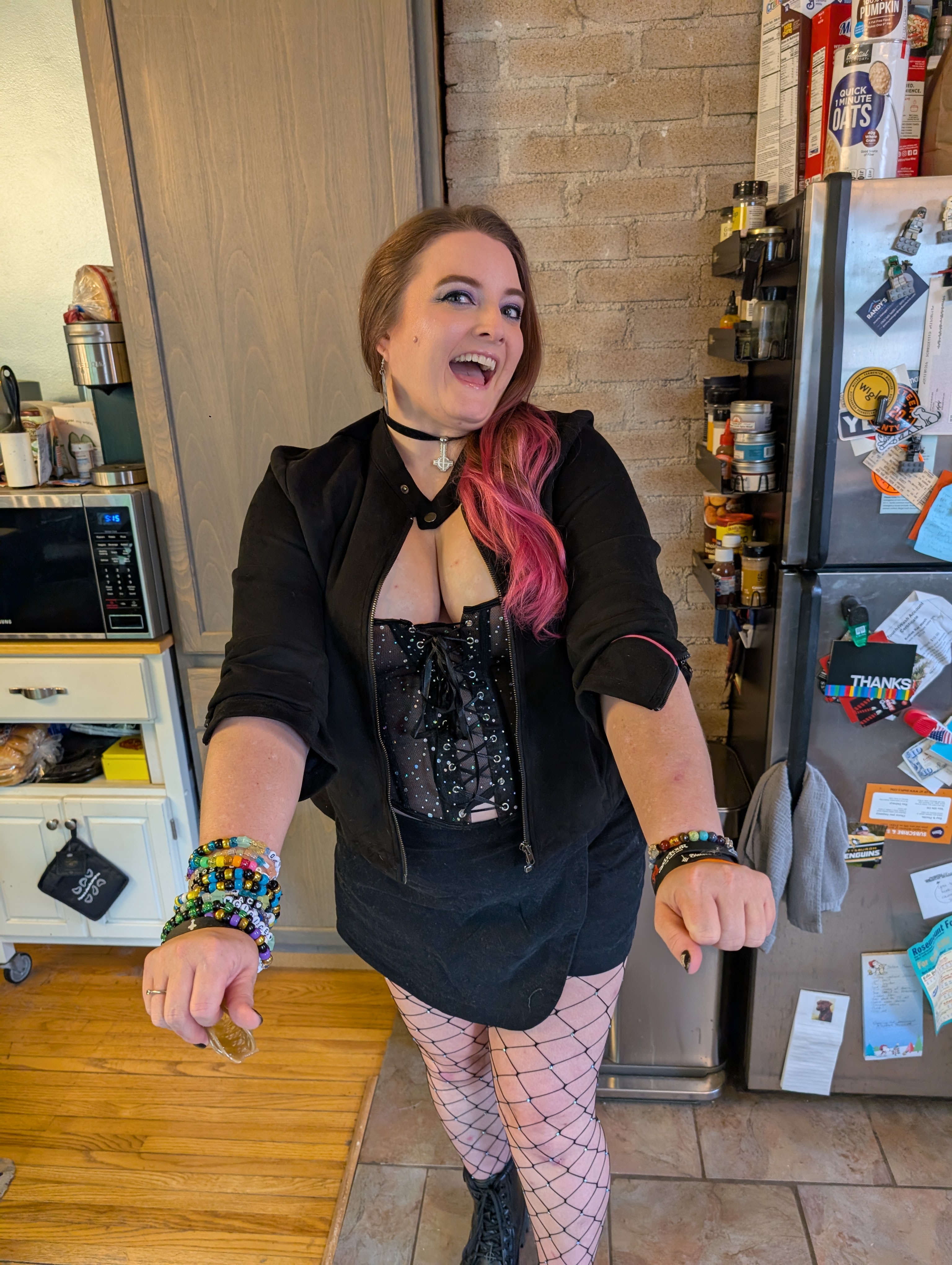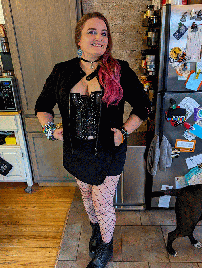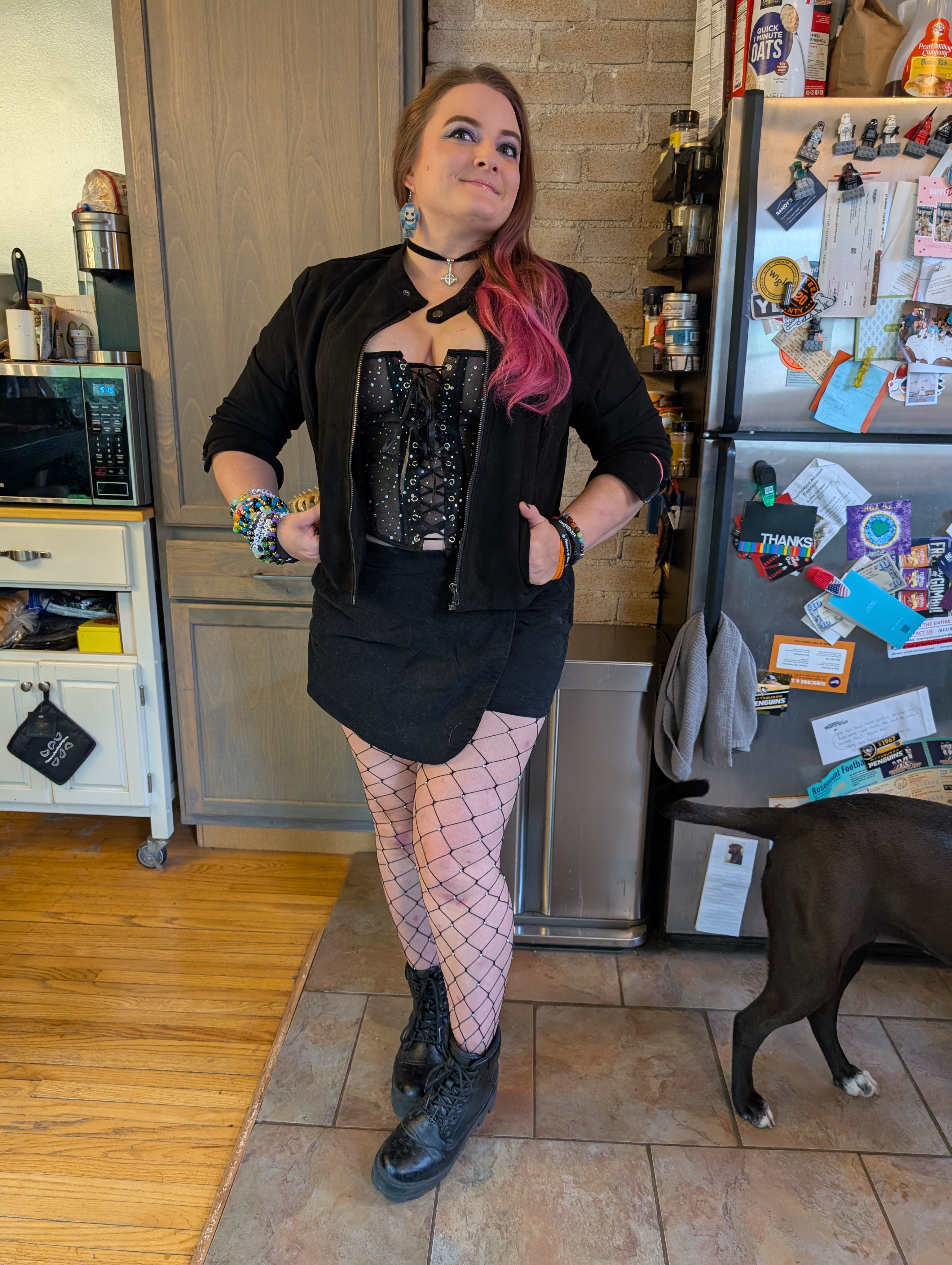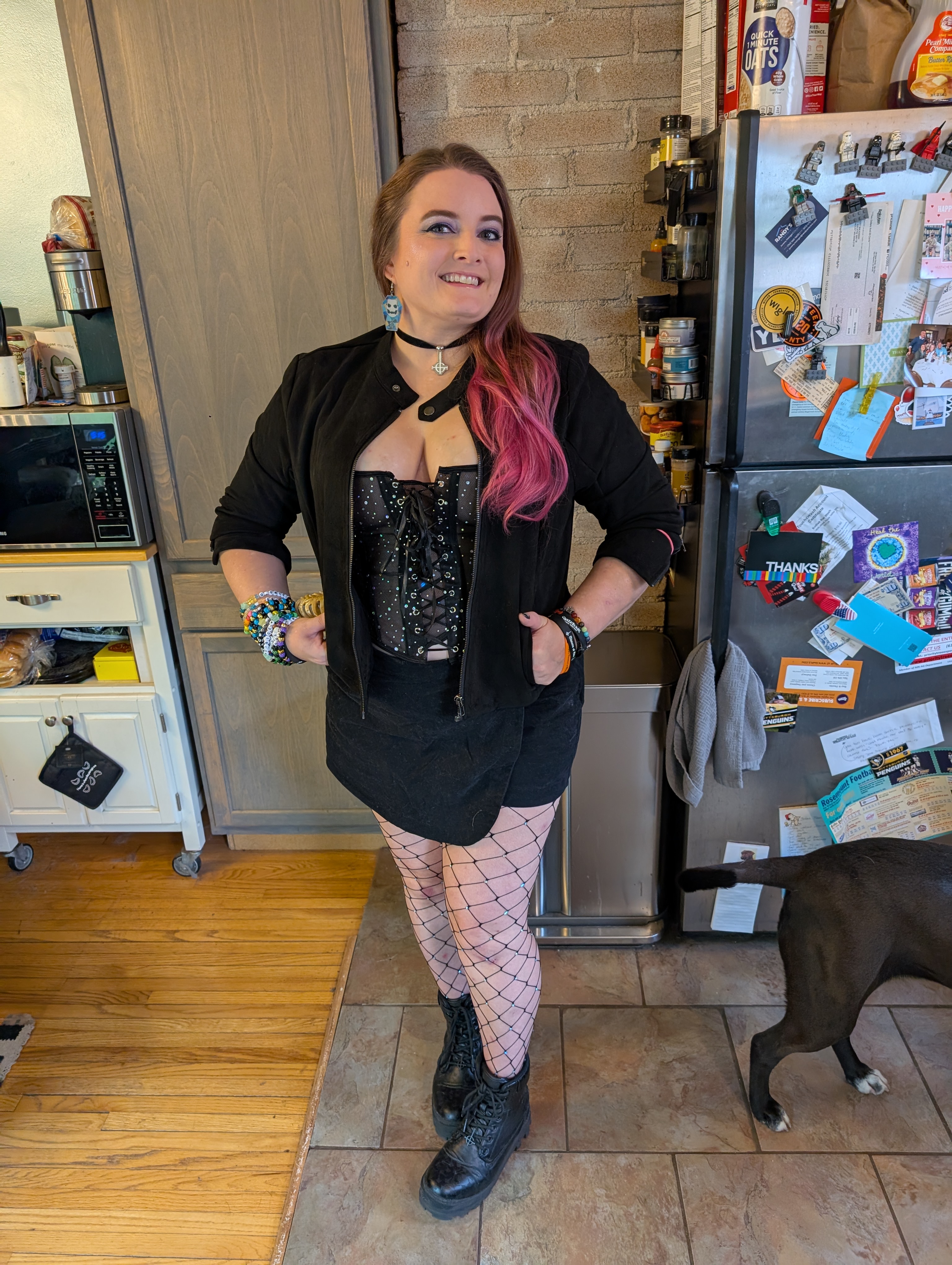 This was probably my favorite Ghost Ritual outfit to date. Black faux-suede jacket, sheer, sparkly black corset top, black shorts/skirt, rhinestone fishnets, my official Ghost boots and choker, and I even painted a glow-in-the-dark Grucifix on my matte black with glitter-tipped nails! But don’t worry, next leg of Skeletour, I’ll have a purple sequin jacket 😉💜